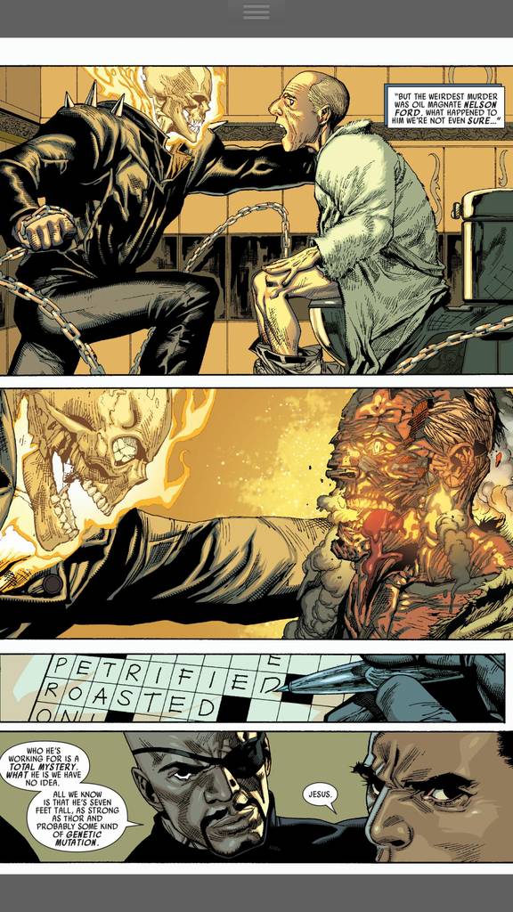 Grazie all’aiuto di un medium i Vendicatori apprendono di chi si tratti: il Johnny Blaze dell’universo Ultimate è un uomo che, durante il suo viaggio in moto con la fidanzata Roxanne, è stato ucciso insieme a lei da una setta di satanisti, per compiere un rituale che li potesse rendere uomini di successo. Mephisto, il diavolo, dà però a Johnny la possibilità di ritorcere il patto contro di loro, stringendone uno con lui: in cambio della sua anima, e di vent’anni di addestramento all’Inferno, lui potrà tornare a vendicarsi dei suoi carnefici, e Roxanne, con la mente ripulita di ogni ricordo di lui, resuscita e può vivere una vita normale con un marito e dei figli. Un’origine diversa da quella classica, e che richiama alla mente storie come “Il Corvo” di James O’Barr, ma in cui non manca una cosa, la volontà di Johnny Blaze di fare qualcosa per cambiare la situazione, la sua disposizione a sopportare un grande dolore per il bene di qualcun altro, e naturalmente, il desiderio di vendicarsi.
