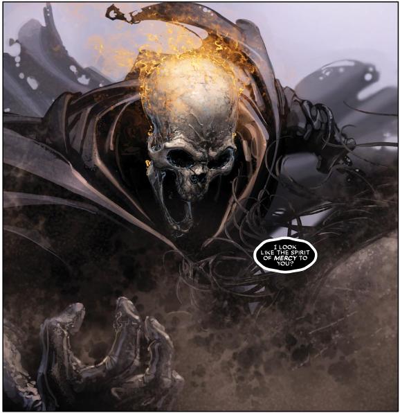 Ghost scavalca il confine e corre dall’altra parte per fargli le linguacce (o meglio, lo farebbe se avesse la lingua). È esattamente ciò che fin dal primo impatto si collega al male, il teschio, l’idea della morte; le stesse fiamme, che in altro contesto potrebbero essere viste positivamente, insieme a quel teschio non possono che presagire pericolo e violenza, giusto un secondo prima di pensare all’inferno e alla dannazione eterna. Quando vedi l’oscurità dei suoi abiti, le catene intorno al suo corpo e la scia di fuoco dietro di lui, non sono che una conferma, è come se già li avessi visti: come se avessi un’idea inconscia di come apparirebbe la punizione, l’ira divina, di che aspetto avrebbe l’Inferno se venisse a reclamare un peccatore sulla Terra, e quell’aspetto si stesse presentando a te proprio com’era nella tua mente. Ed è una cosa visivamente così intensa e assoluta, così perfetta, una così riuscita riproduzione di un’idea che avevamo in mente anche senza accorgercene, che non ti interessa altro che guardarlo, senza dovergli assegnare parti, senza interesse nel sapere se indicherà come colpevole te o chi sta accanto a te.