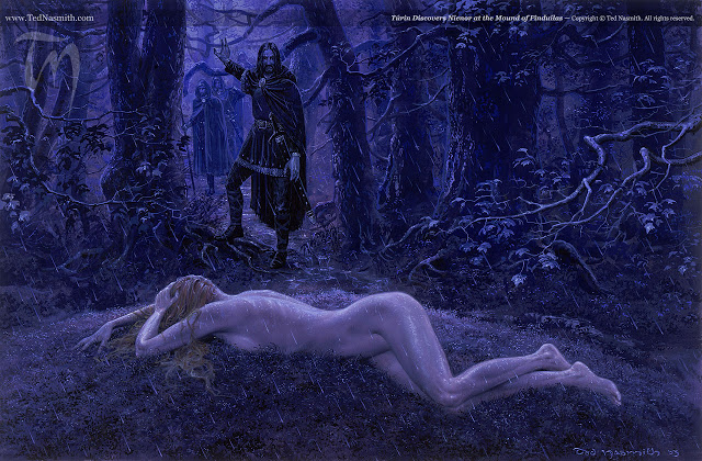 Ma ciò che veramente grava su di lui è la sua anima, un’anima che ha bisogno del sangue e della violenza, che ricerca la battaglia ovunque vada e sacrifica le vite degli altri sul campo, trascinandole dietro ogni volta che (sia nel Doriath che nel Nargothrond che nel Brethil) convince i popoli che incontra a muovere guerra aperta contro gli Orchi; che dopo ogni massacro è offuscato dalla tenebra, la tenebra del male che compie o quella di Glaurung, ma che finisce sempre per riprendersi: ed ecco, e qui voglio solo intessere un mio ricamo intorno alla storia, ecco, dicevo, che la battaglia contro il drago, la manovra più importante che lui compia in un’ottica macroscopica delle guerre del Beleriand, il momento che costituisce il punto più alto del cammino degli eroi nella maggior parte delle storie, una prova che avrebbe potuto annientarlo, non lo finisce, ma lui gli sopravvive, e tale è il punto cui arriva la sua gloria che l’unico nemico che costituisce ancora una sfida è lui stesso, sì che è solo con la sua morte che la sua sete di sangue si può placare.