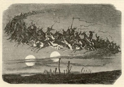 Anche così, è meraviglioso assistere all’evoluzione del mito della caccia selvaggia, di certo anche per il suo significato e le reinterpretazioni fatte da culture diverse e artisti con personali finalità e linguaggi, ma in primo luogo, almeno per me, per lo straordinario potere evocativo che essa suscita, tanto in termini visivi quanto in termini di suono, perché se queste storie sono così tante e si sono conservate attraverso i secoli è perché l’immagine di una schiera di cavalieri fantasma attraverso il cielo è un’immagine potente, temibile, sublime come poche altre nel nostro immaginario. Così tanto che, come si vedrà nel prossimo post, è perdurata nell’arte e nella narrazione fino ad oggi. La corsa della caccia selvaggia, anche se cambiano i cavalli e i cavalieri, non si può fermare.