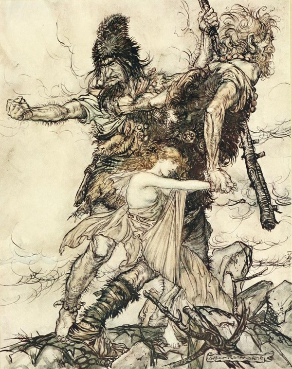 Un personaggio di questo tipo è il gigante Fasolt che compare nella Chanson d’Ecke, enorme e a cavallo di un destriero adeguato mentre insegue una donna attraverso le selve. Suoi fratelli sono i giganti Ecke e Birkhild, sua madre Uodelgart. Fasolt compare anche ne La Première Aventure de Dietrich, dove è un orco ed esige un tributo, naturalmente una fanciulla, dalla regina dei nani, Virginal. Inutile dire che anche i giganti e gli orchi, nel mondo nordico, sono, come i nani, fortemente associati al mondo dei morti, e racconti come questo mostrano un’intenzione di ricostruire una storia dei regni sovrannaturali. Ancora più interessante, però, è che Fasolt rimandi al vasto mondo di leggende di quel Dietrich, più noto col nome di Teodorico il Grande e principale guida della caccia selvaggia nelle leggende italiane. Ascrivibile anch’egli alla figura del cacciatore maledetto, il sovrano ostrogoto del VI secolo, che condivideva il credo ariano del suo popolo e per questo fu in conflitto con l’aristocrazia cattolica romana, figura in una storia che racconta di come, dopo aver visto una cerva dalle corna d’oro, l’abbia inseguita e sia stato reso il capo della caccia selvaggia. Diverse versioni, poi, lo vogliono impegnato in una caccia che arriva fino alla Sicilia, finendo nell’altro mondo attraverso l’Etna o lo Stromboli.