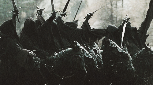 I Nazgul sono antichi re degli Uomini che ricevettero nove anelli del potere da Sauron, l’oscuro signore, attratti dalla menzogna con la quale egli corruppe tutti i suo servi: la promessa di non morire. Gli anelli del potere, per chi non ci avesse fatto caso, hanno fondamentalmente una funzione della quale le altre sono manifestazioni: permettono di separare le cose dallo scorrere del tempo e dalla distruzione che esso comporta, garantendo agli esseri mortali di non morire (come accade a Gollum e a Bilbo), o nel caso degli Elfi, che non temono per la propria morte, la conservazione dei luoghi e della bellezza del mondo che essi sanno essere soggetta al decadimento. I nove re tennero quegli anelli fino ad esserne consumati, e a poco a poco si allontanarono dal mondo fisico e visibile per passare sempre più tempo nel mondo spettrale dell’invisibile, finendo per non poterne più uscire. Questa una nuova, terribile forma della negromanzia adoperata da Sauron, maestro nell’arte del controllare gli spiriti. Celati da armature e mantelli neri sotto i quali nessun volto fu visto mai più essi servirono Sauron grazie alle abilità ottenute dal loro stato -immortalità, immunità al sonno, alla fame, alla sete o a qualunque malessere fisico, e un pericoloso fiuto che li attirava inesorabilmente verso gli altri anelli del potere, come dei cani da caccia- essi non potevano essere uccisi a meno che un incantesimo non spezzasse la stregoneria (gul) che li teneva in vita, e vagavano per la terra di mezzo su cavalli neri allevati (e forse sottoposti anch’essi alla magia) proprio allo scopo di tollerare la presenza degli Spettri dell’Anello, insopportabile per qualunque altro essere vivente.