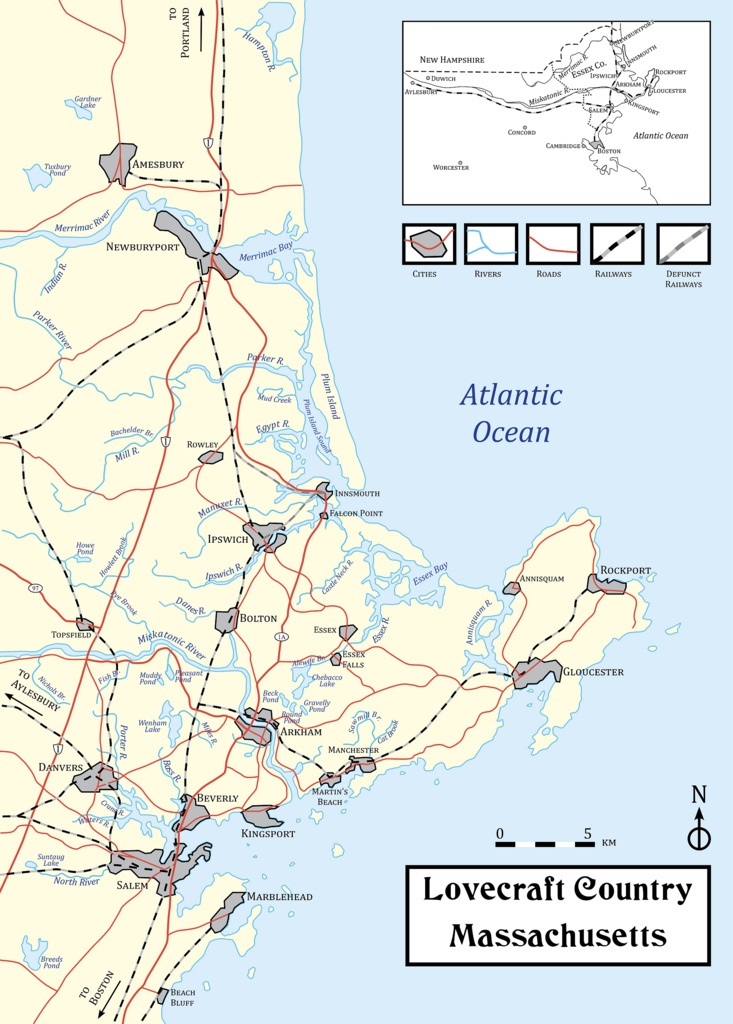 E questa unione indistinta tra reale e irreale Lovecraft la manifesta in molteplici modi, il primo dei quali è l’avere ambientato molte delle sue storie nel New England, nel Massachussets e in altri stati americani adiacenti, nei quali località effettivamente esistenti, libri effettivamente scritti e reperibili e avvenimenti storicamente accaduti sono posti accanto ad altri di pura invenzione, dei quali i più celebri sono la città di Arkham, il fiume Miskatonic e il villaggio costiero di Innsmouth.