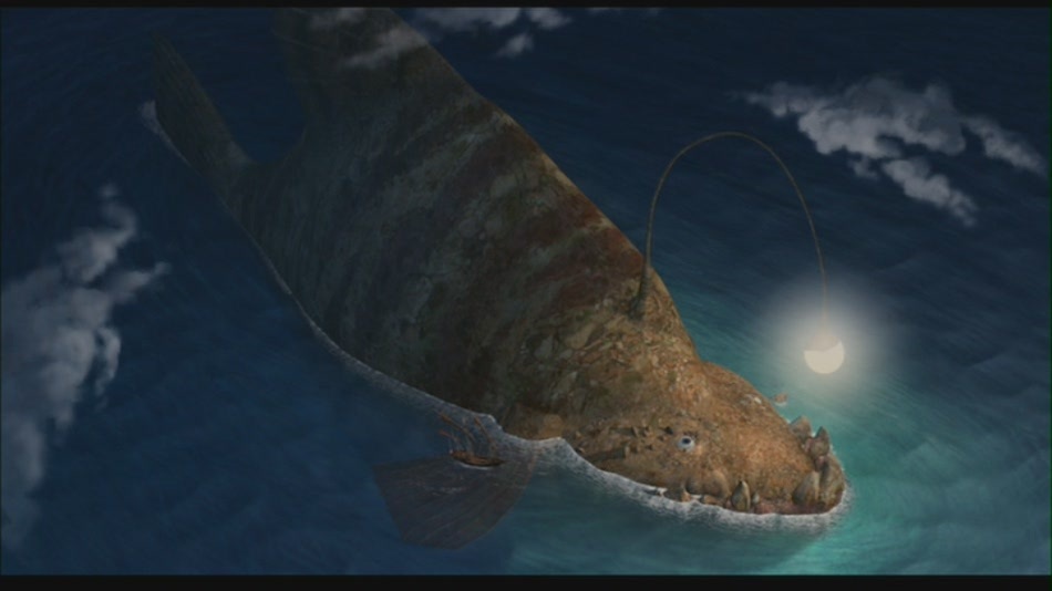 La prima volta che ho assistito a una scena come quelle narrate, con lo stupore che si prova quando non si ha mai sentito di una storia del genere, è stato nel film Dreamworks “Sinbad: La leggenda dei sette mari” (2003), dove il protagonista e il suo equipaggio esplorano l’isola e ne scoprono la vera natura quando, durante una discussione un po’ accesa, staccano un pezzo di terra: il suolo trema per l’interezza dell’isola, tutta la vegetazione viene riassorbita dal terreno, e sotto i loro piedi si apre un’enorme occhio, mentre una lunga antenna con la punta luminosa oscilla sopra di loro. L’inquadratura successiva mostra chiaramente le sembianze del pesce – con un antenna simile a quella di molti pesci abissali-; segue la rocambolesca fuga sulla nave, accompagnata dal grido di Sinbad, che ora mi sembra riecheggiare del terrore di tutti i marinai delle storie già raccontate “È un pesce!”. Fortunatamente, gli uomini riescono a salvarsi, e fissando delle cime alla pinna del pesce riescono a percorrere molto velocemente un ampio tratto di mare.