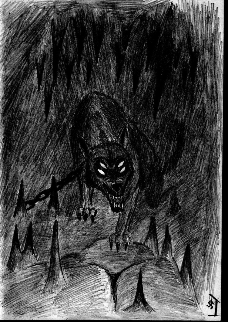 | Garmr, guardiano di Hel, dinanzi a Gnipahellir. https://kolesnikov.deviantart.com/art/Garmr-i-Gnipahellir-325856061 |