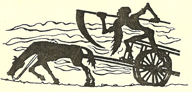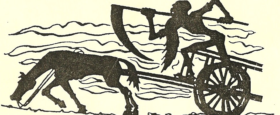 Si racconta di un ragazzo che si trovò in questa situazione, e che sapeva bene cosa si stesse avvicinando. Curioso di vedere, e sicuro di potersela cavare con un po’ d’astuzia, si nascose in un fossato sul bordo della strada, e attese. Presto riuscì a scorgere sulla strada un’ombra proiettata dalla luna, o da un lume non troppo lontano, un’ombra che si espandeva man mano che l’oggetto cui apparteneva si faceva più vicino. Poi lo vide: due grandi cavalli neri come la pece, legati a un carro di legno marcio con assi spezzate, sul quale stava seduto qualcuno. Un mantello logoro e un grande cappello a tesa larga, ancora più scuri dei cavalli. In una mano teneva le briglie. Nell’altra un lungo bastone che teneva con l’estremità inferiore poggiata sull’asse di legno sotto i suoi piedi, mentre all’altra estremità, superando l’altezza della sua testa, era saldata con dei chiodi una lunga lama che curvava minacciosamente verso il basso. Una falce.