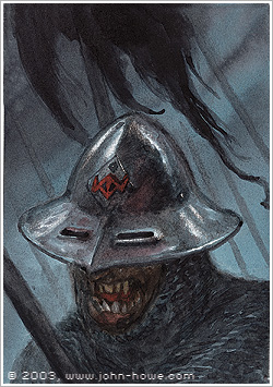 Le immagini qui accanto sono di John Howe e mostrano un Troll di collina e un Troll di montagna. Il testo non parla mai di corna, ma la scelta di Howe mi piace, perché conferisce ai Troll un aspetto demoniaco come quello suggerito dal loro nome, in particolare quello di montagna, che ha una testa animalesca; d’altra parte, l’idea che Tolkien aveva di queste sue creature risulta non corrisposta.
