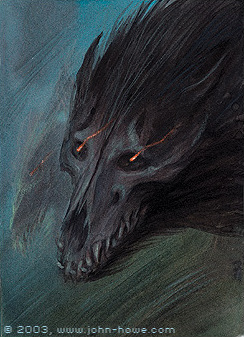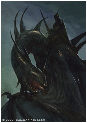 “La grande ombra scese come una nuvola cadente. E, meraviglia! era una creatura alata: se uccello, assai più grande di qualunque altro uccello, e stranamente nudo, sprovvisto di penne e di piume, e le sue immense ali parevano pelle tesa fra grinfie di corno; emanava un fetore mortale. Era forse una creatura di un mondo scomparso, la cui razza, sopravvissuta in montagne nascoste e fredde sotto la Luna, non si era ancora estinta, covando questi ultimi arcaici esemplari, creati per la malvagità. E l’Oscuro Signore se n’era impadronito, alimentandoli con cibi crudeli, facendoli crescere oltre la misura di ogni altro essere alato; li aveva dati ai suoi servitori da usare come destrieri.” (Il Ritorno del Re, La battaglia dei campi del Pelennor)