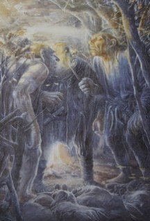 | Ted Nasmith, “Trasformati”, mostra Beren e Lúthien camuffati grazie alle pelli di Draugluin e Thuringwethil. |