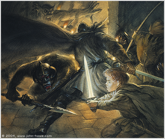 | John Howe – Merry e Pipino catturati dagli Orchi. |