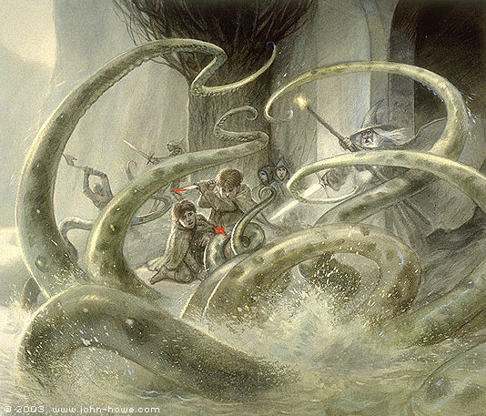 “«Lo ignoro» rispose Gandalf; «ma le braccia erano tutte guidate da un unico scopo. Qualcosa è strisciato o è stato spinto fuori dalle cupe acque sotto le montagne. Vi sono cose più antiche e più immonde degli Orchi nei luoghi profondi della terra». Egli non espresse però a voce alta il pensiero che qualunque fosse la creatura vivente nel lago, essa, di tutta la Compagnia, aveva afferrato per primo Frodo.”