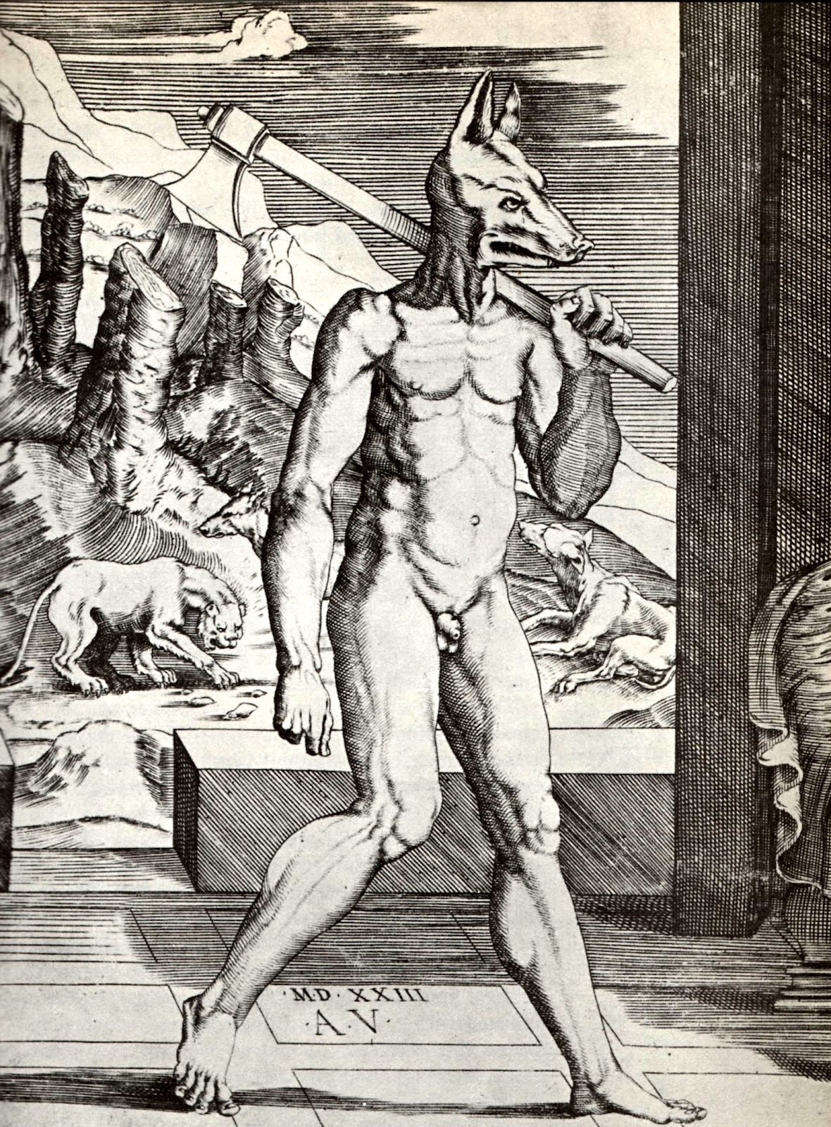 Quando si parla di licantropi, infatti, si tende spesso a cominciare col racconto del mito di Licaone, o, al massimo, a citare l’aspetto teriomorfo del dio egizio Anubi, che non presenta però aspetti connessi alla licantropia, trasformazioni o legami con la follia, e su cui dunque non mi soffermerò. Da segnalare, se non altro in osservanza del saggio di Donà, la scultura dell’uomo leone (Loewenmensch) di Hohlenstein-Stadel, databile fra 35.000 e 40.000 anni fa, che mostra un uomo (o, secondo alcuni, una donna) con la testa leonina, un prototipo di uomo-bestia (non sappiamo se un dio, un eroe, un sovrano, o che cos’altro) che ai giorni nostri non sembra poi così lontano.