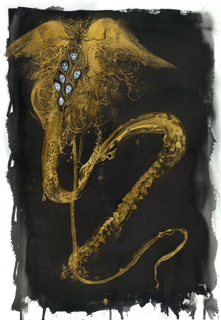 Ha un collo di fiamme, dodici ali le cui piume portano gli occhi di ogni cosa che è mai vissuta, e attraverso quegli occhi guarda ma non vede, come attraverso quegli occhi è vista, ma non guardata.