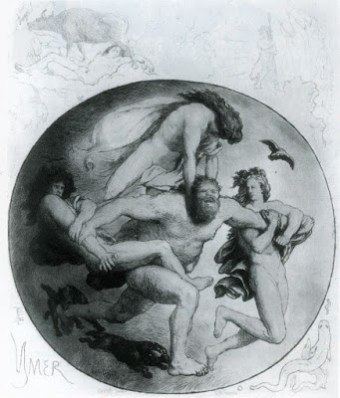 Mentre questo secondo ceppo di discendenza iniziava a ramificarsi, anche Ymir, il primo nato, diede origine ad altri da sé, pur simili a sé: e si racconta che, mentre dormiva, abbia sudato copiosamente, sicché sotto le sue mani nacquero un gigante, da una parte, e una gigantessa dall’altra; poi, sempre mentre dormiva, i suoi piedi entrarono in contatto, e quella potenza generatrice diede vita a un nuovo gigante, dal quale sarebbe discesa la razza di quelli che chiamiamo jötnar, i giganti della brina: il suo nome era Þrúðgelmir, e possedeva sei teste. E benché dovesse essere certamente un mostro incommensurabile, pensa quanto ben più mostruoso doveva essere il suo genitore, più simile alla materia cosmica che alle creature di questo mondo. Il primo figlio di Þrúðgelmir si chiamava Bergelmir. In seguito, la stirpe divenne sempre più numerosa, creature immani, crudeli come le acque velenose da cui era nato il protogono, che di tutti loro era il più crudele. Egli era chiamato, tra di loro, anche Aurgelmir, ma è conosciuto nei canti dei poeti anche come Brimir e come Bláinn. Spero tu abbia fatto caso a come, anche qui, egli abbia operato il processo generativo attraverso il contatto tra il freddo e il caldo, come questi figli siano nati dalle gocce del suo sudore, non dissimili da quelle degli Élivagar, da cui era nato lui.