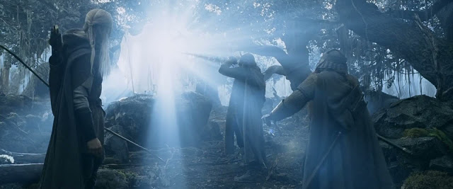Lo guardarono tutti stupefatti. La sua capigliatura al sole era candida come neve, e la sua veste bianca e splendente; gli occhi sotto le folte sopracciglia erano luminosi, penetranti come raggi di sole; in mano aveva lo strumento del potere. Paralizzati dalla meraviglia, dalla gioia e dal timore, rimasero senza parole.