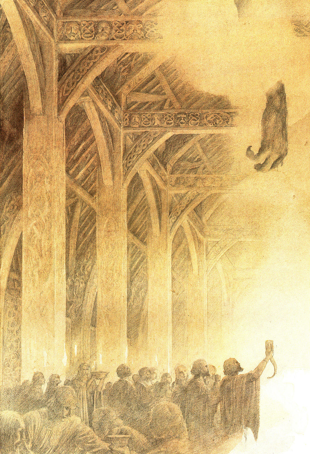 | La sala di Heorot in un’illustrazione di Alan Lee per il Beowulf. |