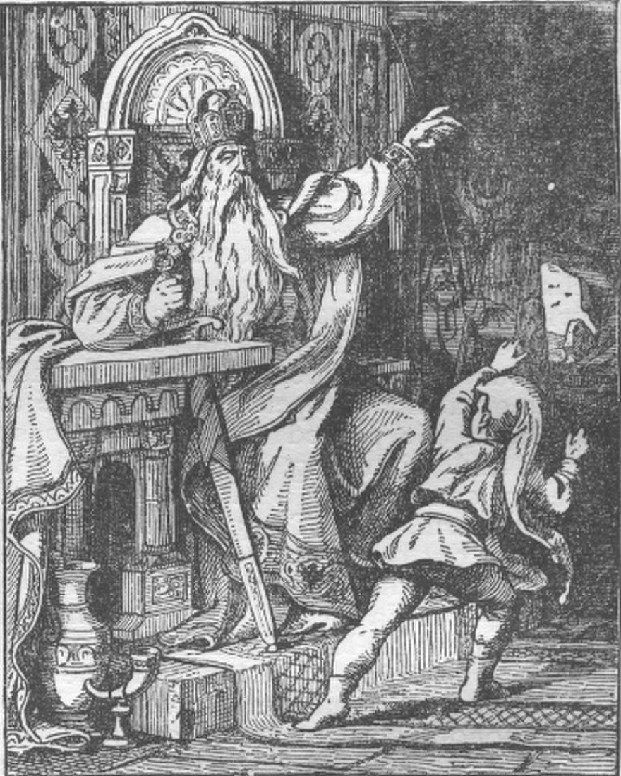 | Barbarossa nel Kyffhäuser, insieme al fanciullo menzionato nella poesia di Rückert, in una illustrazione proveniente dalla “Young Persons’ Cyclopedia of Persons and Places”, 1881. |