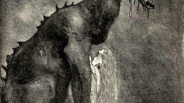 Ma è stato trasformato in un mostro. Un drago, e non una fiera volante avvolta dalle fiamme, al cui passaggio luminoso gli uomini si gettano in terra scongiurando o pregando per una sorte più favorevole; o un possente serpente dell’antichità, barone di un vasto appezzamento di morte dove nessuno si avventuri a sfidarne la volubilità d’animo, timoroso del suo veleno. Il suo corpo è troppo grande, troppo pesante, e quando cammina sulla terra è goffo, privo di ogni grazia. Scivola agilmente nel mare, ma non può immergersi troppo a lungo e troppo in profondità, nella tenebra vergine al tocco beffardo del sole, perché ha bisogno di respirare aria come i figli degli uomini. La costa è rivolta verso il nord, da dove non può venire nessuno che sia vivo, e dove i saggi dicono che sia possibile prendere la via che porta al Niflheimr.