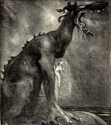 Il mare resta in silenzio, e la donna chiama di nuovo, più forte. Allora il mare sospira, e la sua superficie si increspa, finché le acque sussultano e si schiudono su quello che ne sta emergendo, come una veste slacciata. Una groppa di colore scuro, ricoperta di pelliccia e coronata da una fila di punte d’avorio ricurve, retta da un paio di zampe da lupo con le dita palmate, avanza fuori dal mare facendo dondolare a destra e sinistra la lunga testa, che dietro ha orecchie a punta e creste come pinne di pesce, e davanti le mascelle di un drago. Il lungo collo è chino sotto il peso di quella testa, come se dovesse sostenerne i pensieri. I suoi occhi sono socchiusi. Spinta da altre due zampe da grossa lucertola, la creatura trascina una lunga coda crestata, e si arresta al limitare tra mare e terra.