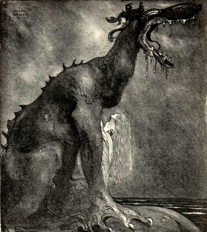 Il mostro marino la guarda negli occhi, non cessa il ringhio, ma non parla.