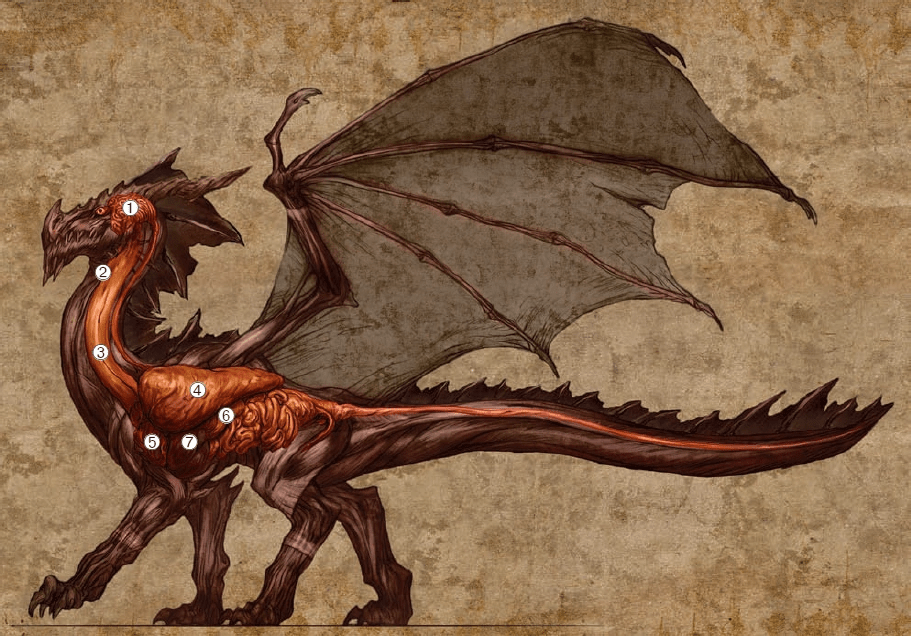 Più complessa è la spiegazione del Draconomicon, un manuale di supporto di Dungeons & Dragons, di cui ho consultato la versione per la terza edizione ma vi riporto un’immagine da un manuale diverso (dovrebbe essere quello per la quarta edizione). Essa si fonda sulla magia, ma la lega a una struttura anatomica precisa. Il soffio dei draghi di D&D deriva da un organo attaccato al cuore, chiamato suggestivamente “fondamento draconico” (draconis fundamentum, nella versione inglese), attraverso il quale passa il sangue irrorato dal cuore prima di essere portato nel resto del corpo. Il fondamento draconico viene considerato un organo magico, e la magia è dunque alla base della biologia dei draghi, spiegandone sia il soffio che la capacità di volare superando i limiti aerodinamici del corpo: esso produce un’energia elementale, dello stesso tipo della sostanza che il drago sputa dalla bocca e cui è immune (fuoco, ghiaccio, elettricità etc.), e questa energia partecipa al suo metabolismo, aumenta la capacità fisica delle ali e dei muscoli del volo e trasforma l’aria assorbita dai polmoni nel soffio elementale, che risale la trachea, raggiunge la laringe e quindi la bocca. Della laringe si dice anche che è ampia al punto di consentire al drago di produrre una vasta gamma di suoni, incluso il ruggito.
