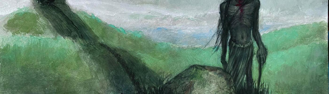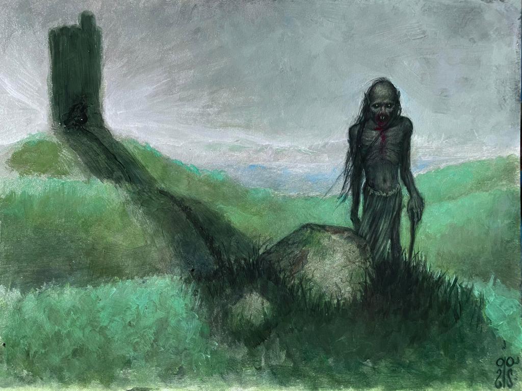 Ho scoperto Abhartach un anno fa, grazie all’affascinante dipinto di Richard Ingersoll che trovate nella copertina e qui di seguito, e mi sono interessato a lui dopo aver appreso della sua rappresentazione, in un film recente di cui vi parlerò alla fine, come un super vampiro capace di attrarre il sangue delle sue vittime fuori dal corpo anche da grande distanza. Ho ripreso il tema dopo un bel viaggio a Dublino lo scorso luglio, non direttamente collegato a lui – che appartiene alla tradizione dell’Irlanda del Nord – e la ricerca sul suo conto mi ha portato a scovare parti di mitologia celtica poco conosciute e che hanno finito per collegarsi con i macrotemi dell’aldilà e della Caccia Selvaggia, di cui avete letto nell’articolo precedente. Oggi, abbracciando pienamente il vampirismo, ci occuperemo invece, e personalmente, di Abhartach, nonché del suo rapporto con il succhiasangue più famoso del mondo.