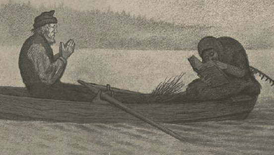 Un giorno Pesta giunse davanti a un lago e convocò il barcaiolo. La sua gonna era blu, lui non la riconobbe e così la prese a bordo. Mentre remava, però, si rese conto di chi stava trasportando, e la pregò di risparmiarlo come pagamento per il traghetto. Pesta aveva con sé il libro dei morti, e dopo averlo consultato rispose: “Purtroppo non posso risparmiarti, ma posso darti una morte senza dolore”. Quando quell’uomo tornò a casa, si sentì stanco come mai in vita sua. Si sdraiò sul letto e poco dopo morì.
